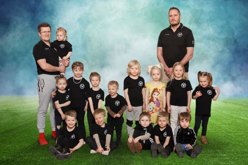 Perhefutis on lapsen ja vanhemman yhteinen harrastus, jossa nautitaan liikunnasta leikinomaisesti yhdessä oppien. Kuvassa on kesällä 2025 mukana olleita reippaita perhefutislaisia.